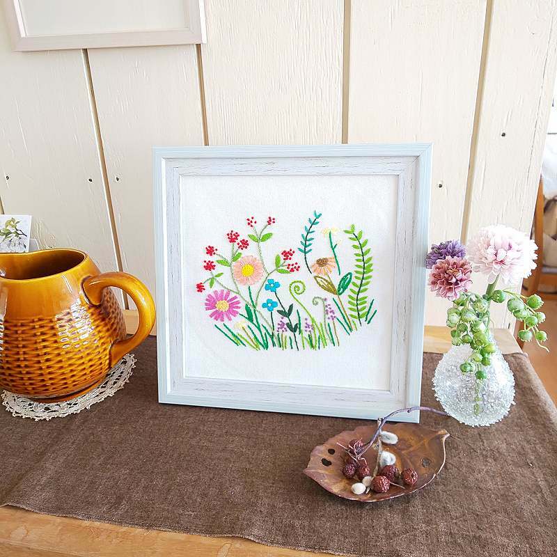 【使用するステッチ】ストレートステッチアウトラインステッチフレンチノットステッチレゼーデージーステッチチェーンステッチサテンステッチプラスチック製の刺しゅう枠が付属してますが、お好みにより別のフォトフレームに入れて飾っても素敵です。