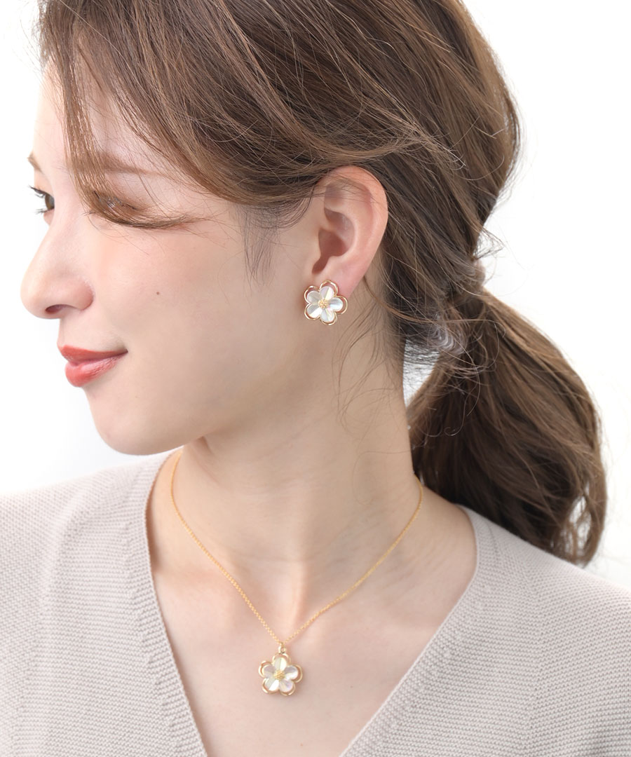 商品説明シェルのような独特の光沢が上品なフラワーピアス・イヤリング。