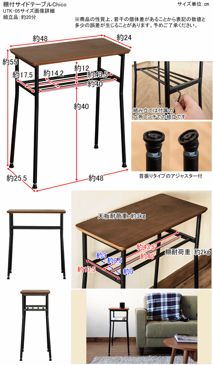 【サイズ】 W480xD255xH550mm (梱包サイズW580xD295xH90mm) 天板サイズ:約W480xD240x厚15mm 天板耐荷重:約3kg 棚耐荷重:約2kg 本体重量:1.6kg(梱包重量:2.8kg) 組立式(約20分/付属の六角レンチで組立) 1梱包 ※商品の性質上、若干の個体差があることから表記の数値と多少の誤差が生じることがあります。